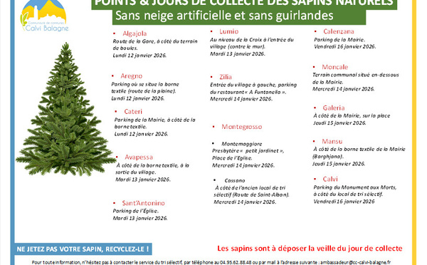 Dans le cadre de l’opération de collecte et de recyclage des sapins de Noël naturels organisée par la Communauté de Communes Calvi – Balagne, un point de collecte sera mis en place à Lumiu au niveau...